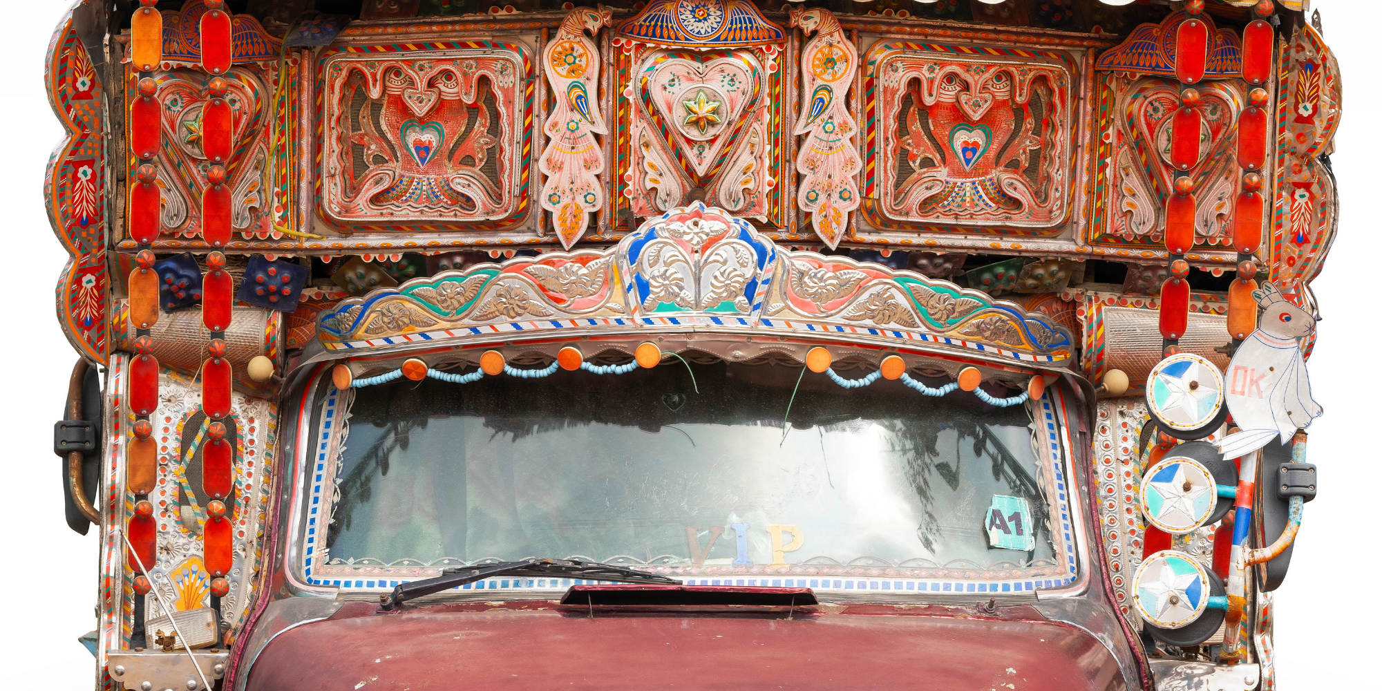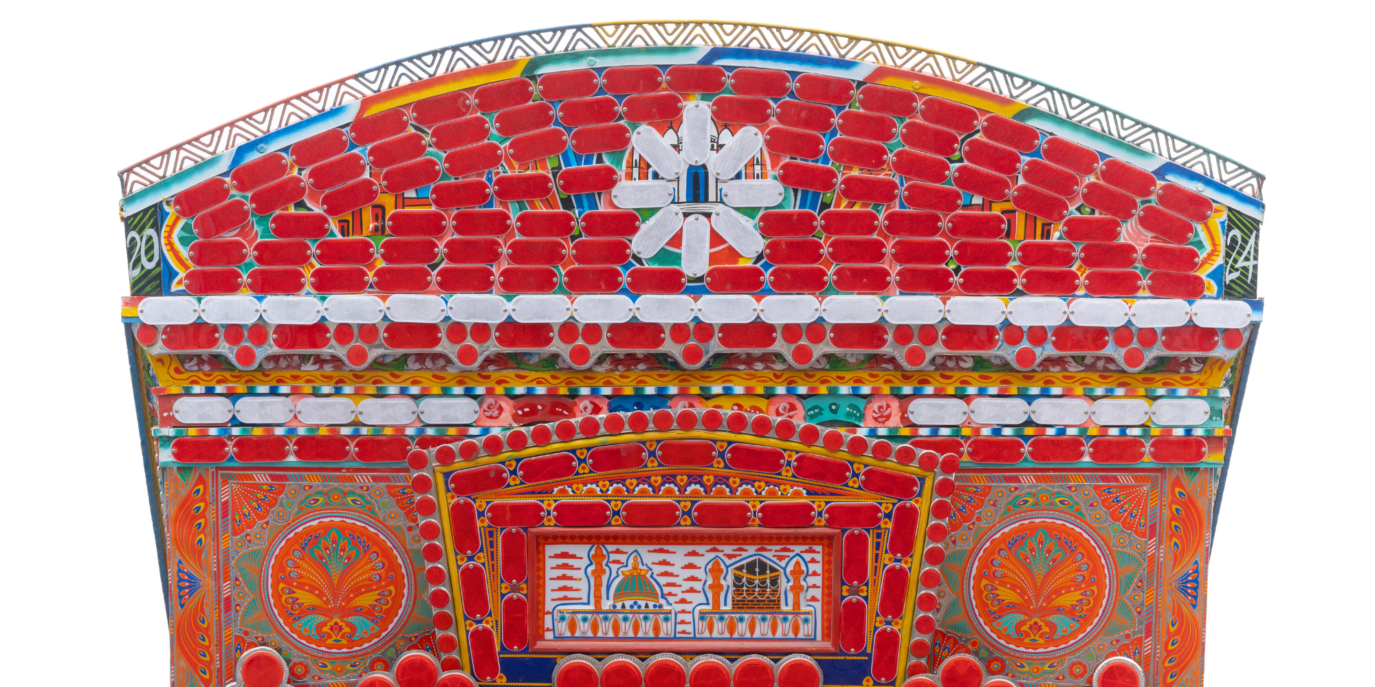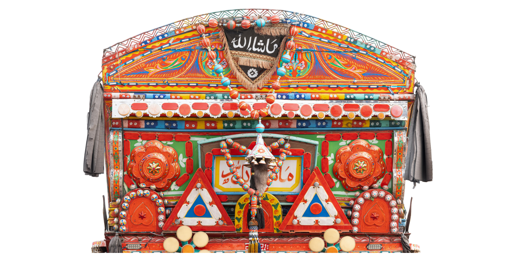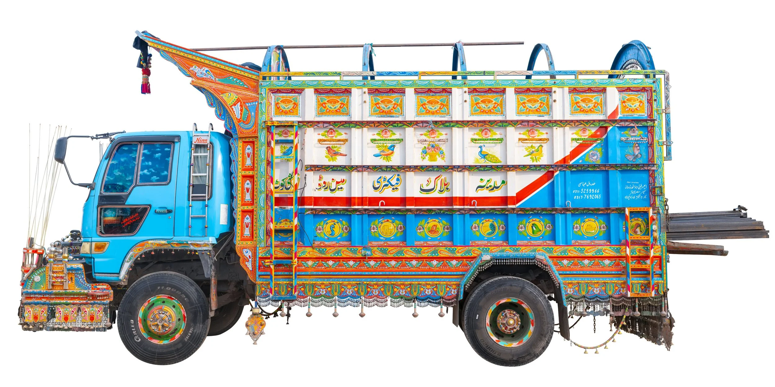 Typisch für viele pakistanische Trucks ist der fehlende obere Abschluss des Laderaums. Stattdessen sorgen Rundbögen für Flexibilität bei hoher Beladung. In Verbindung mit dem ausgeprägten Alkoven über der Fahrerkabine entsteht eine Bauform, die funktionale Anforderungen und ornamentale Gestaltung auf ungewöhnliche Weise vereint. Gerade diese Kombination verleiht dem Fahrzeug eine Formensprache, die in ihrer Konsequenz und Eigenständigkeit weltweit kaum vergleichbar ist.
