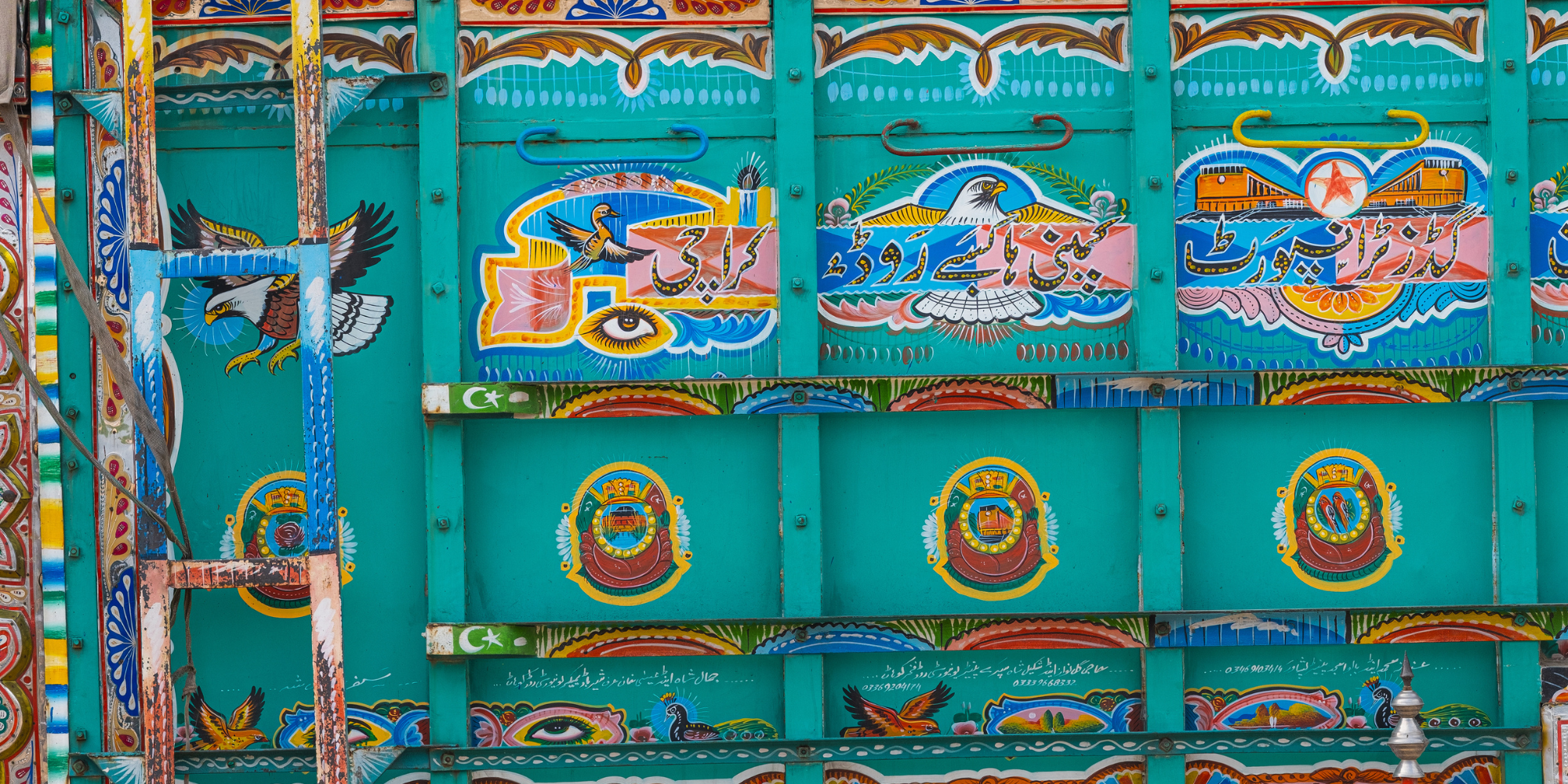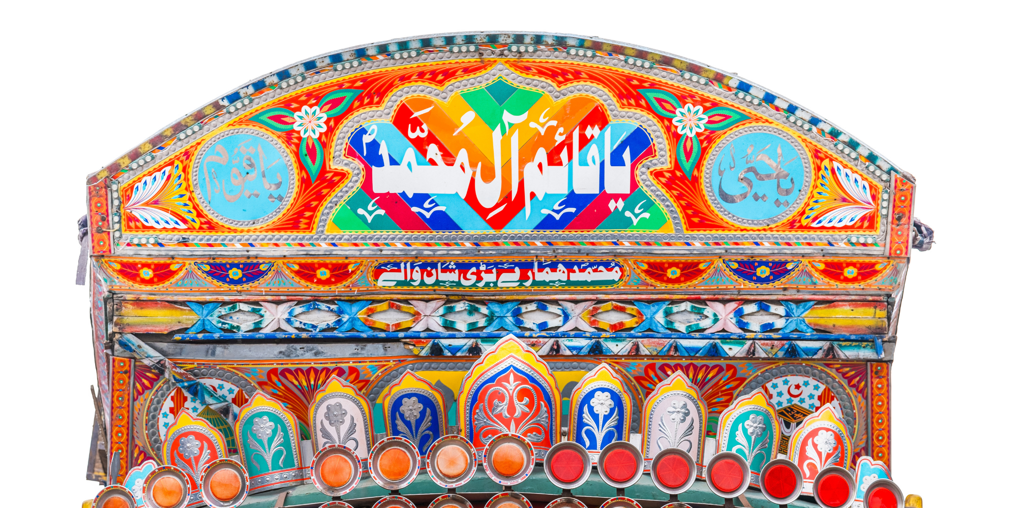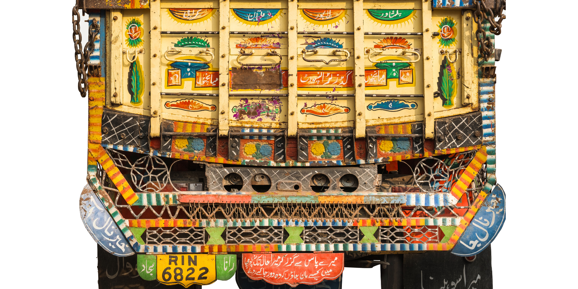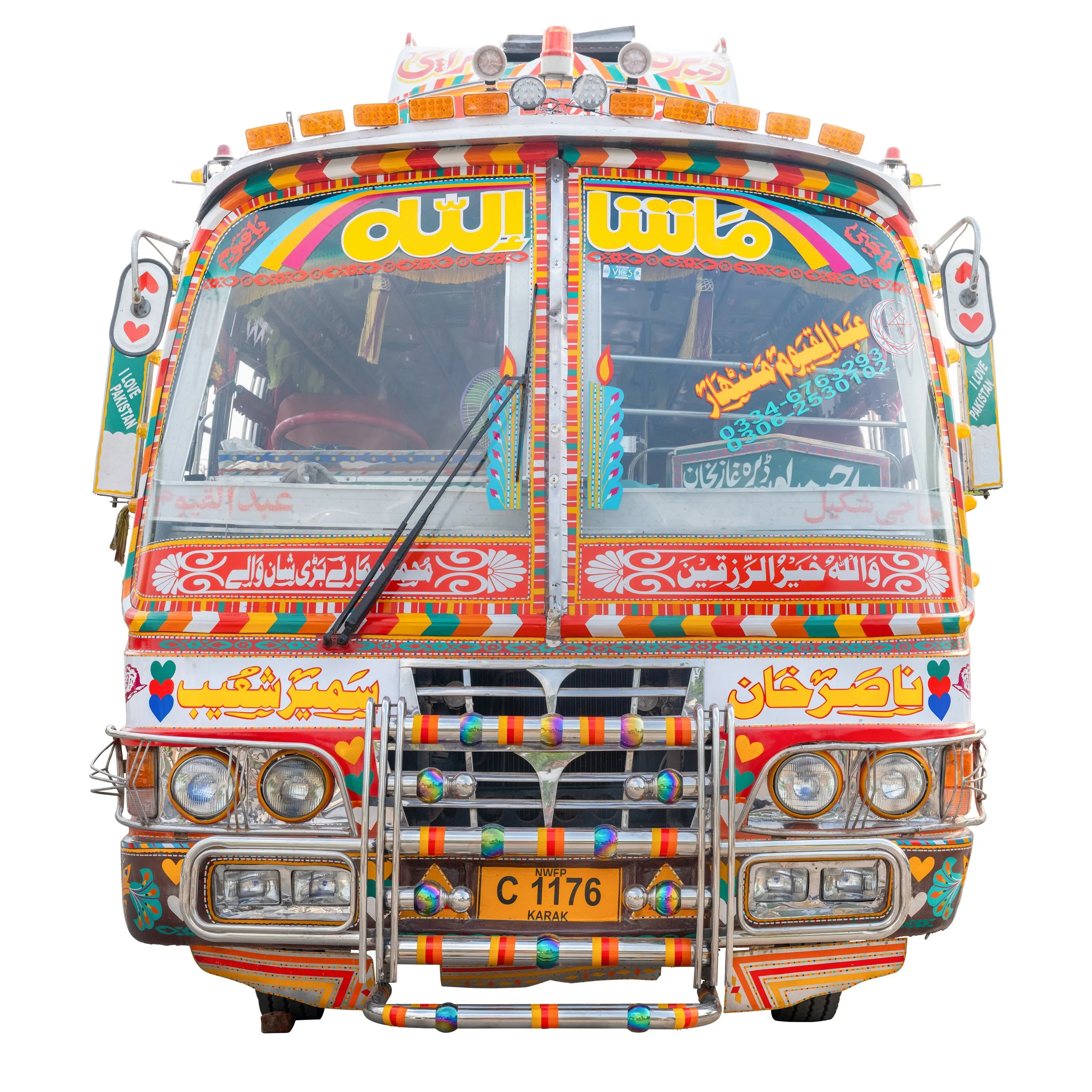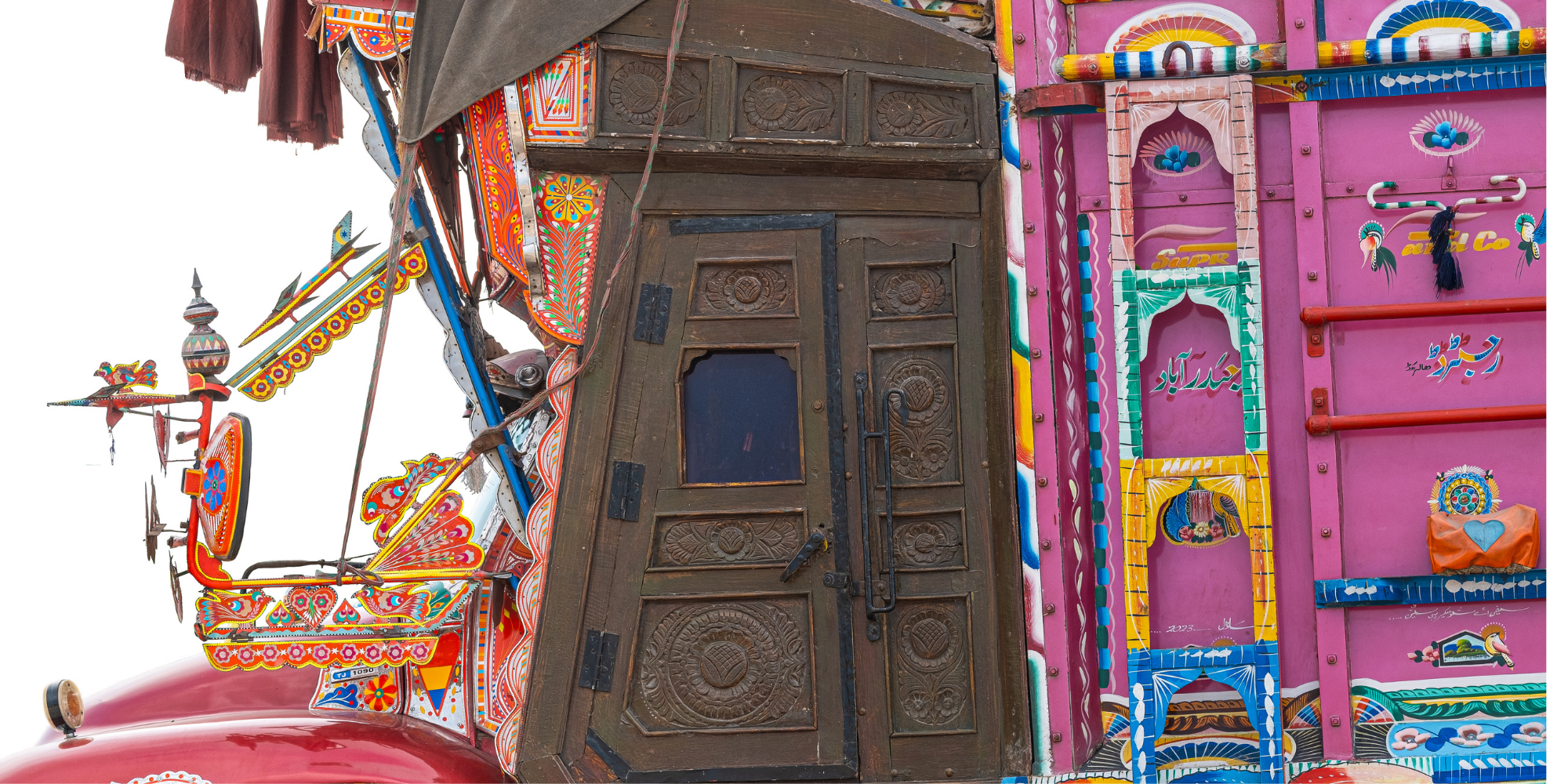 Typisch für viele pakistanische Trucks ist der fehlende obere Abschluss des Laderaums. Stattdessen sorgen Rundbögen für Flexibilität bei hoher Beladung. In Verbindung mit dem ausgeprägten Alkoven über der Fahrerkabine entsteht eine Bauform, die funktionale Anforderungen und ornamentale Gestaltung auf ungewöhnliche Weise vereint. Gerade diese Kombination verleiht dem Fahrzeug eine Formensprache, die in ihrer Konsequenz und Eigenständigkeit weltweit kaum vergleichbar ist.