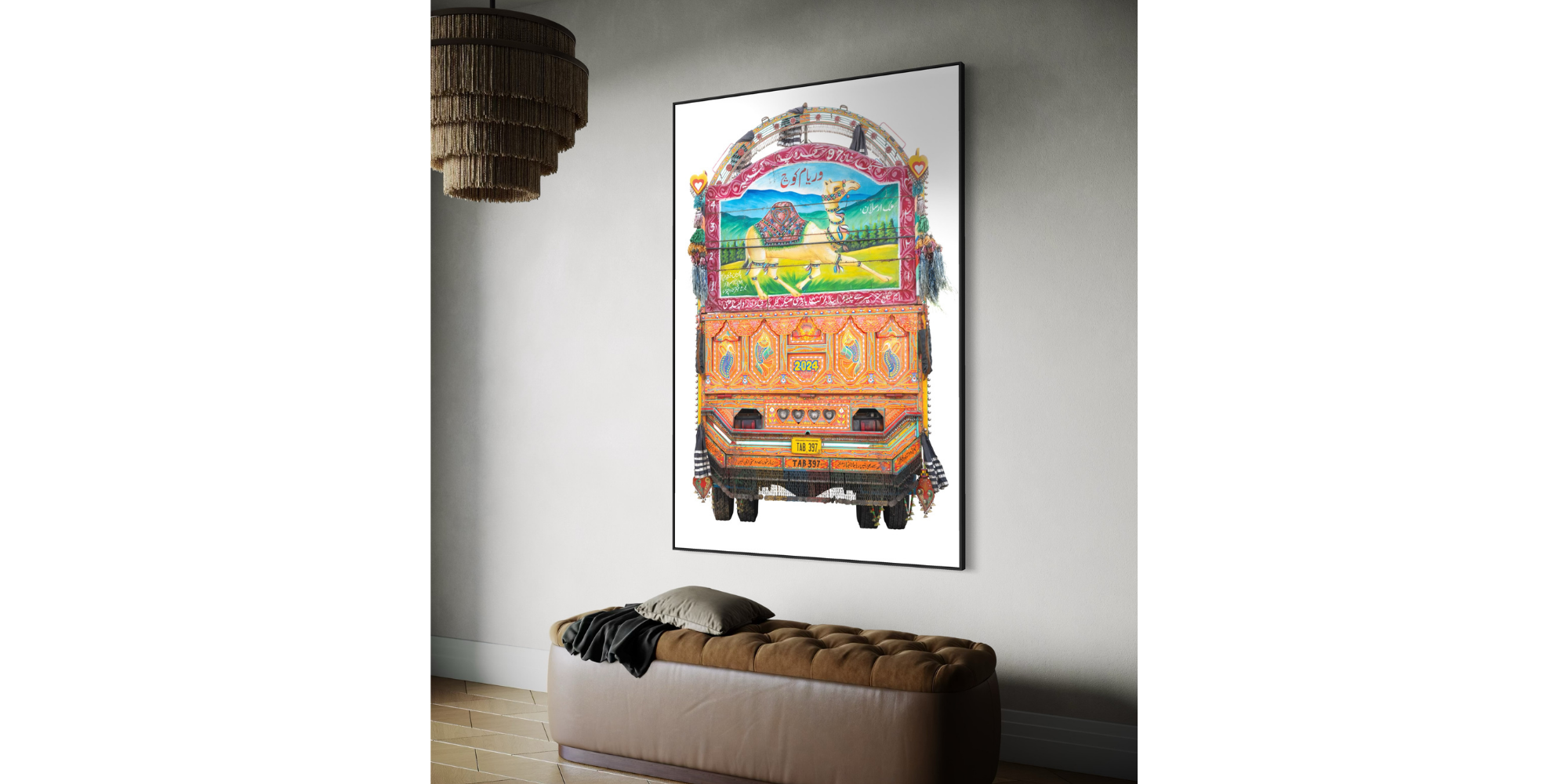 Die pakistanische Truck Art greift häufig auf klassische Bildmotive zurück. Landschaften, bekannte Persönlichkeiten oder seltene Tiere gehören zu den immer wiederkehrenden Elementen dieser Bildsprache. In diesem Fall dominiert ein prächtig dargestelltes Kamel, das sich kraftvoll durch eine surreale Landschaft bewegt. Das Tier ist reich geschmückt und vermittelt Dynamik und Ausdauer. Als traditionelles Transportmittel steht das Kamel sinnbildlich für Zuverlässigkeit und Bewegung und überträgt diese Eigenschaften auf das Fahrzeug und seinen Einsatz.