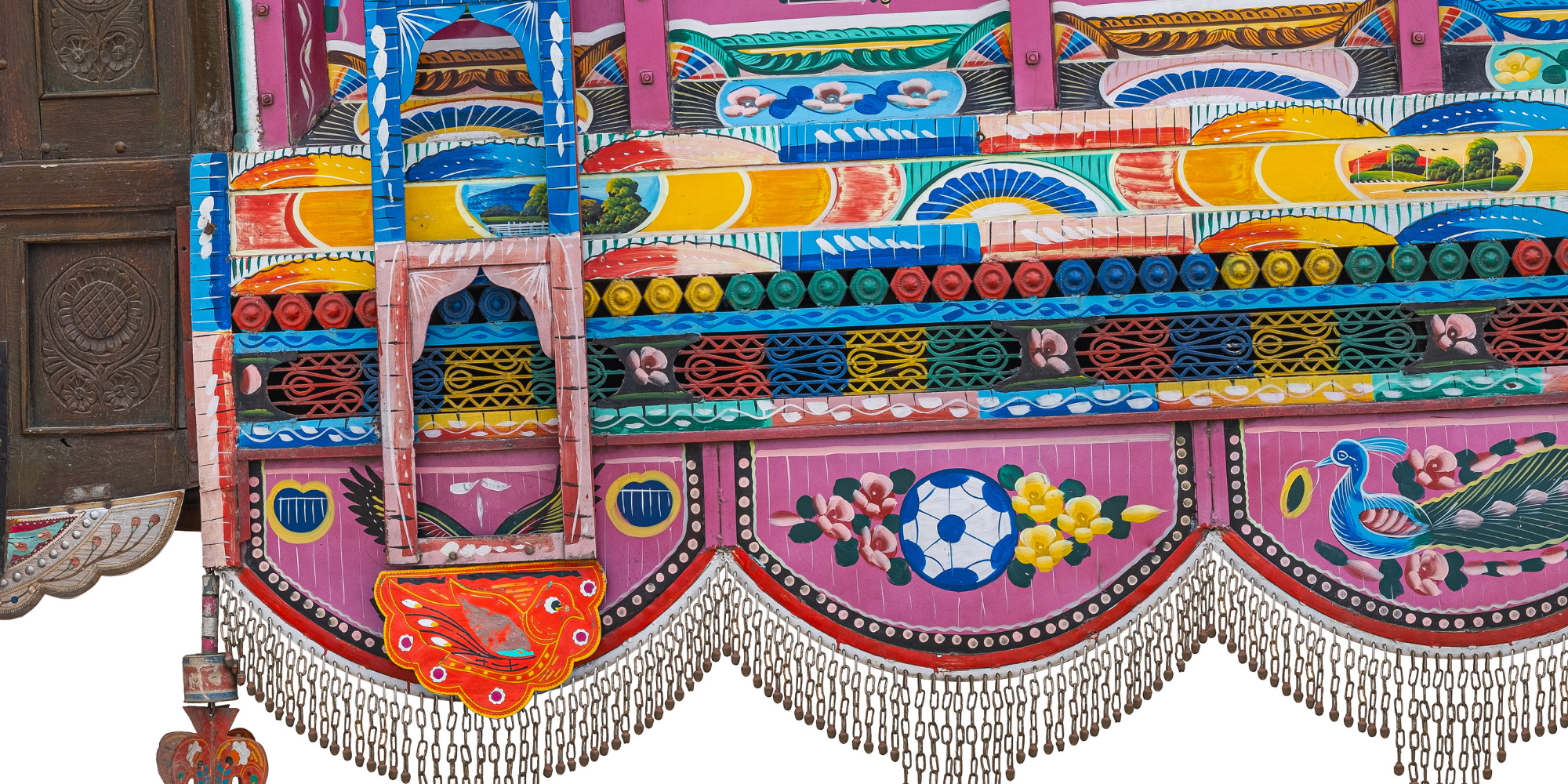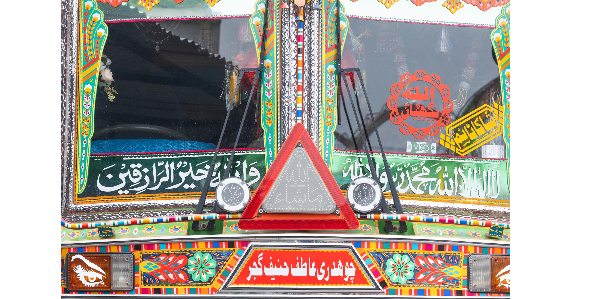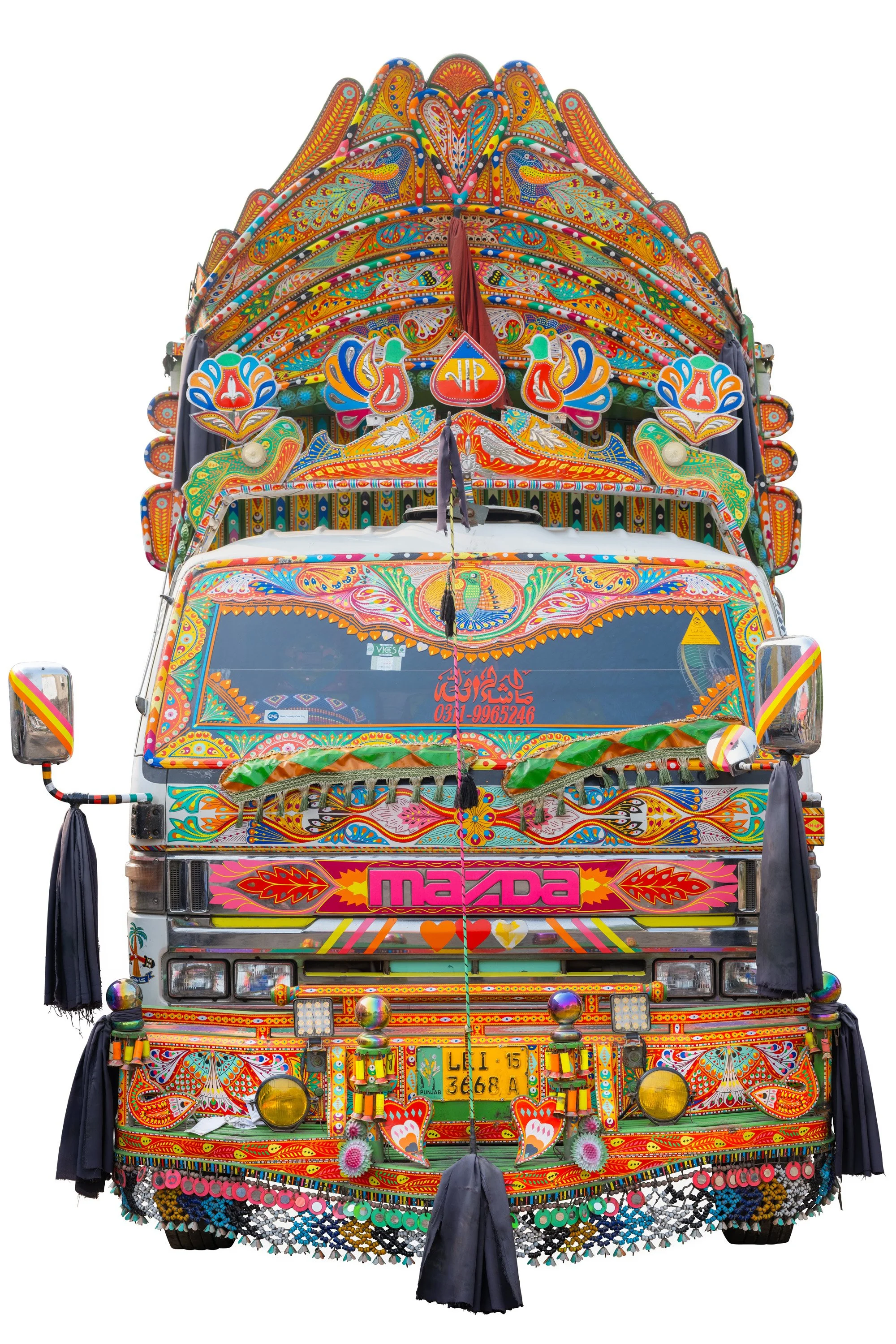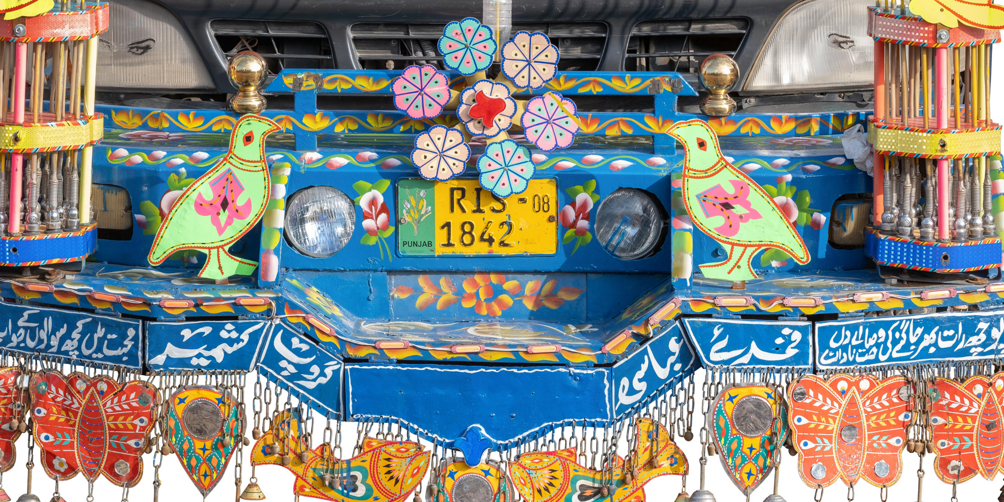 Die Fahrerkabine ist leer, die Türen geschlossen. Der Blick richtet sich vollständig auf die Farbflächen und die reich verzierten Aufbauten im oberen Bereich. Leuchtende Farben, florale Ornamente und symmetrische Muster bestimmen die Bildfläche. Stofftücher und Wimpel erfüllen nicht nur eine dekorative Funktion, sondern sind als Schutzsymbole gedacht. In Bewegung würden sie im Fahrtwind pendeln und dem Fahrzeug eine zusätzliche Lebendigkeit verleihen. Ergänzt werden sie durch die typischen Glöckchen an der Front, die bei nahezu allen Trucks dieser Art zu finden sind.