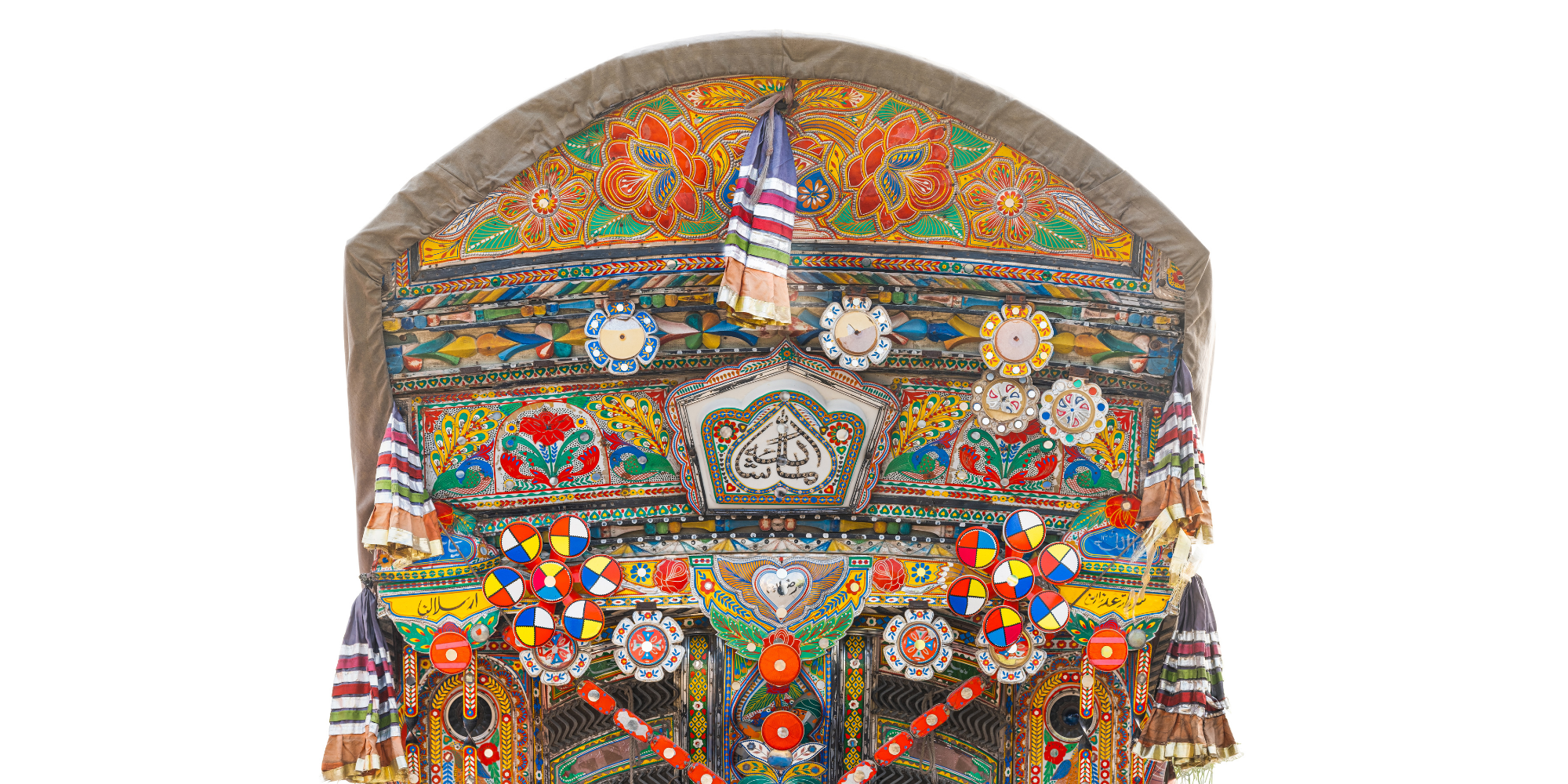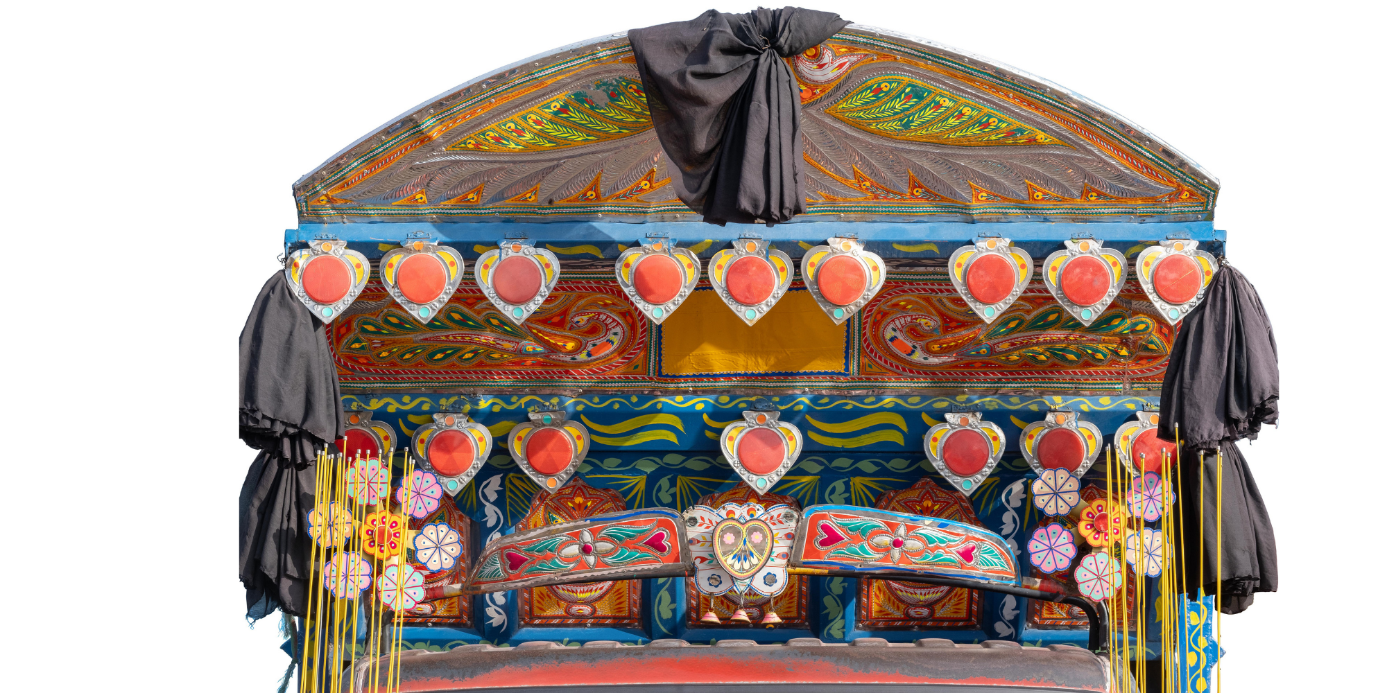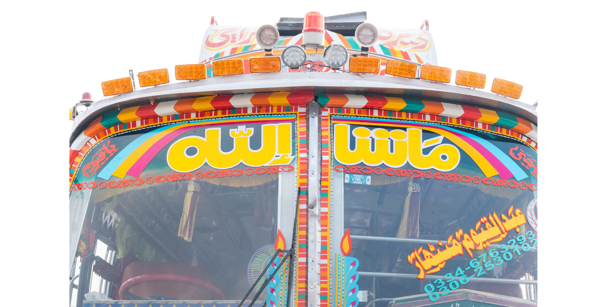 Die Fahrerkabine ist leer, die Türen geschlossen. Der Blick richtet sich vollständig auf die Farbflächen und die reich verzierten Aufbauten im oberen Bereich. Leuchtende Farben, florale Ornamente und symmetrische Muster bestimmen die Bildfläche. Stofftücher und Wimpel erfüllen nicht nur eine dekorative Funktion, sondern sind als Schutzsymbole gedacht. In Bewegung würden sie im Fahrtwind pendeln und dem Fahrzeug eine zusätzliche Lebendigkeit verleihen. Ergänzt werden sie durch die typischen Glöckchen an der Front, die bei nahezu allen Trucks dieser Art zu finden sind.