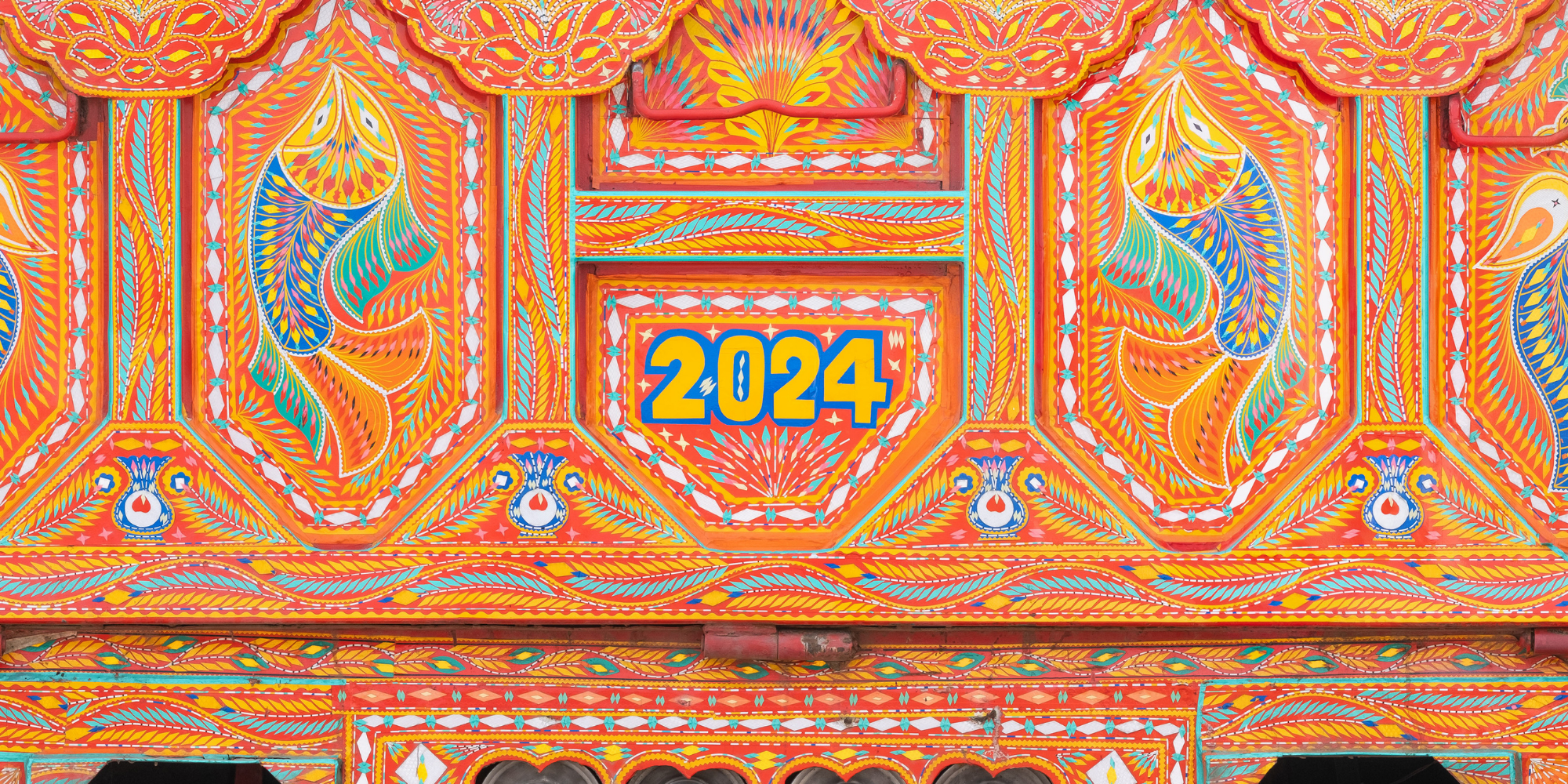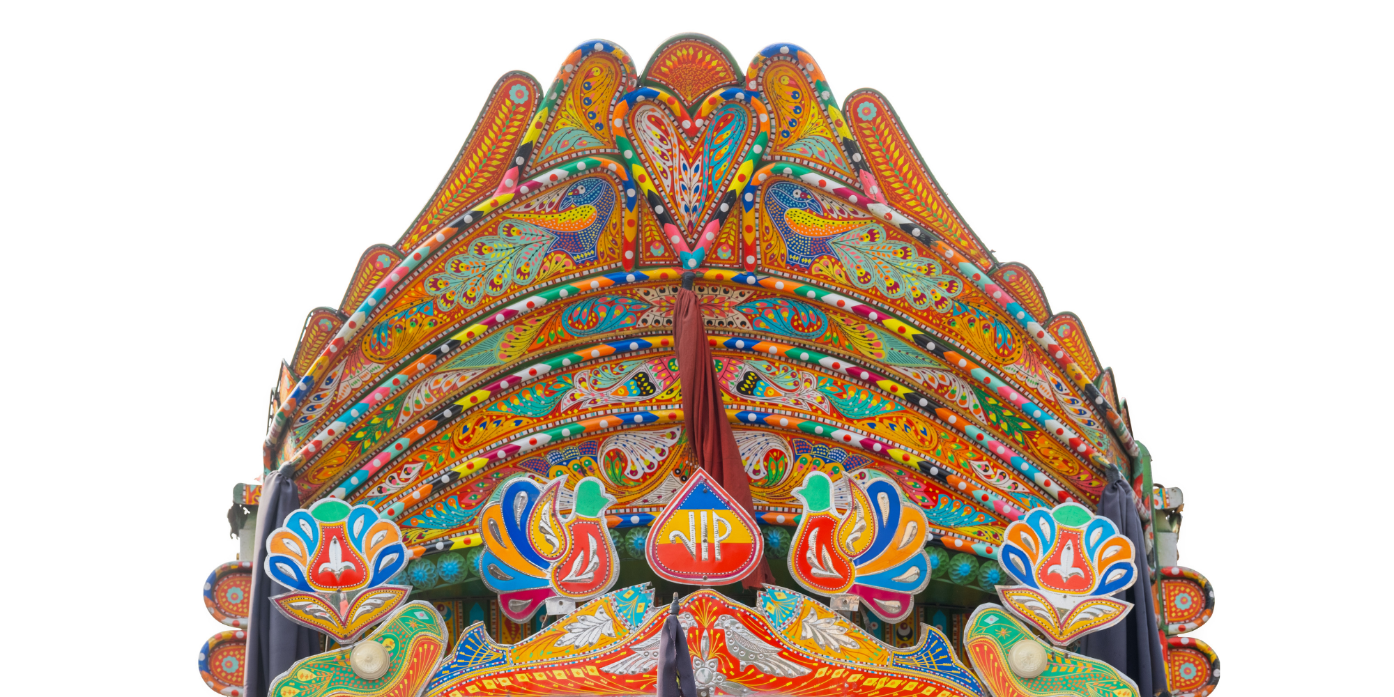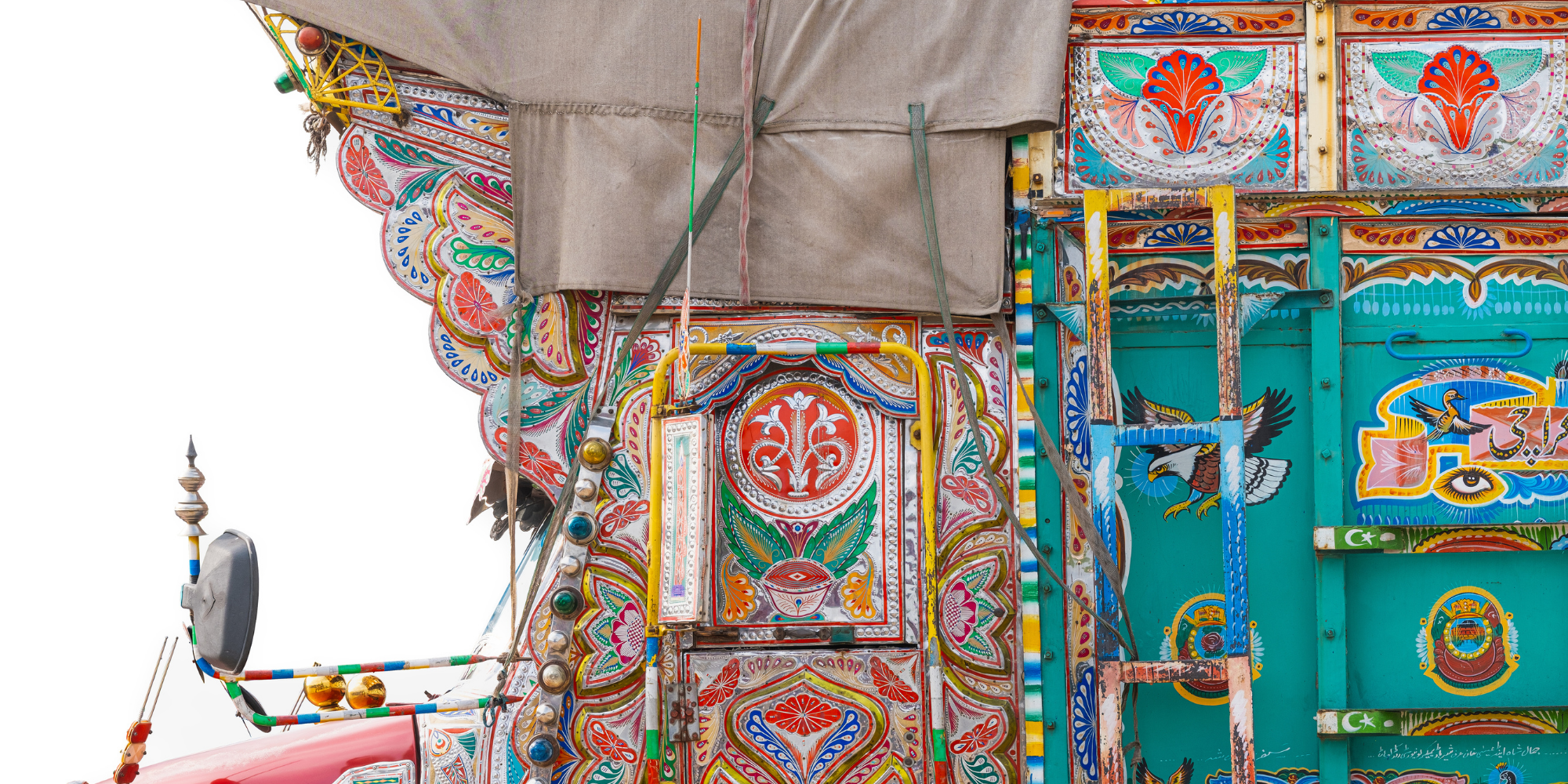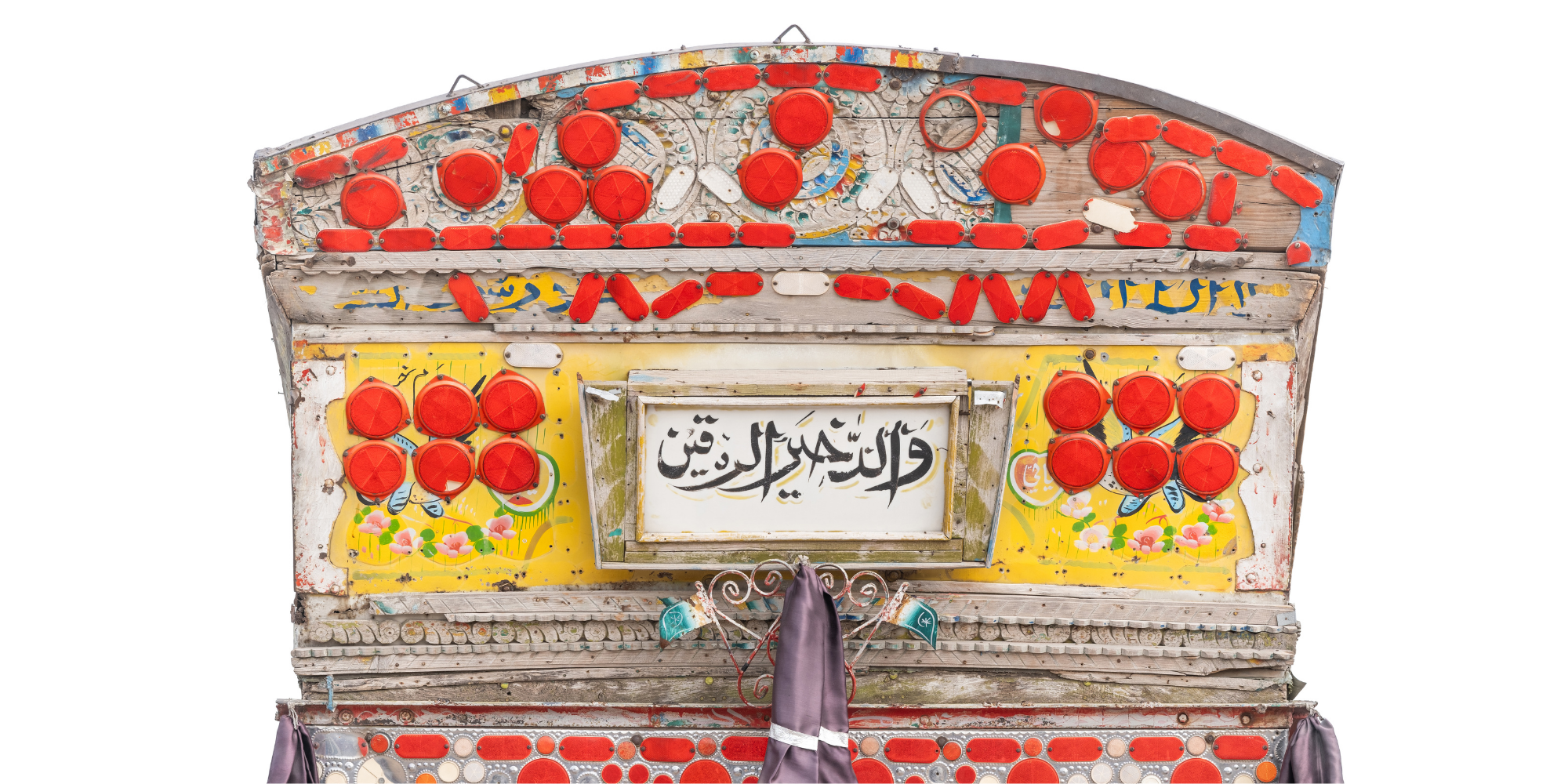 Die Fahrerkabine ist leer, die Türen geschlossen. Der Blick richtet sich vollständig auf die Farbflächen und die reich verzierten Aufbauten im oberen Bereich. Leuchtende Farben, florale Ornamente und symmetrische Muster bestimmen die Bildfläche. Stofftücher und Wimpel erfüllen nicht nur eine dekorative Funktion, sondern sind als Schutzsymbole gedacht. In Bewegung würden sie im Fahrtwind pendeln und dem Fahrzeug eine zusätzliche Lebendigkeit verleihen. Ergänzt werden sie durch die typischen Glöckchen an der Front, die bei nahezu allen Trucks dieser Art zu finden sind.