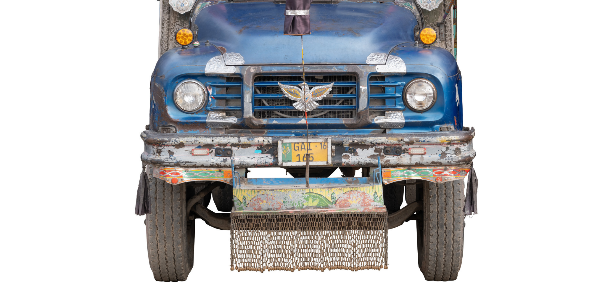Die Frontpartie trägt deutliche Spuren der Zeit. Abgegriffene Lackflächen, verbogene Metallelemente und abgenutzte Ketten verweisen auf ein langes, intensives Leben auf der Straße. Gleichzeitig setzen kleine dekorative Details immer wieder Akzente, die dem Fahrzeug etwas Eigenwilliges und fast Zärtliches verleihen. Der Truck wirkt weniger wie ein Transportmittel, sondern wie ein Körper, der getragen, gepflegt und immer wieder notdürftig instand gehalten wurde.