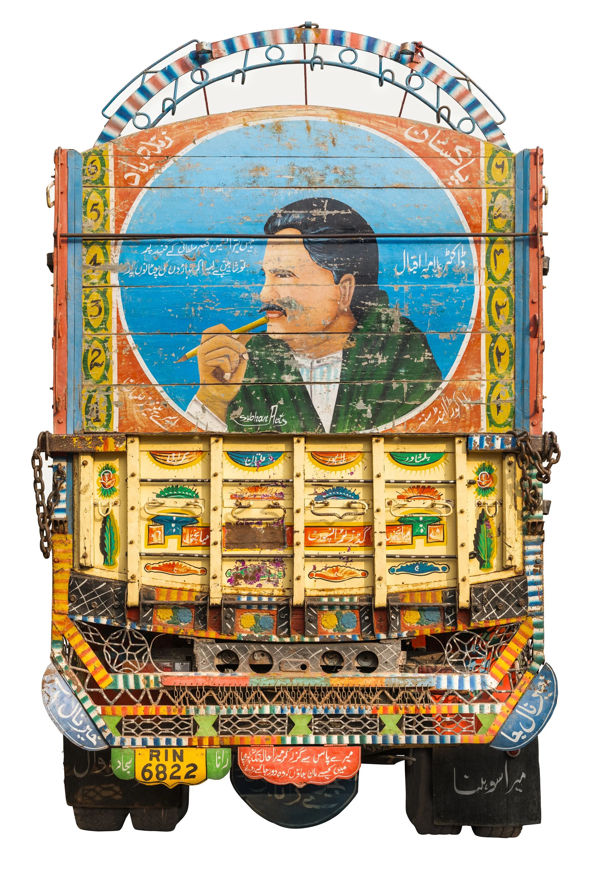 Im Mittelpunkt dieses Trucks steht ein gemaltes Porträt, das sofort eine ruhige, nachdenkliche Stimmung erzeugt. Der dargestellte Mann könnte ein bekannter pakistanischer Schriftsteller oder Dichter sein, versunken in Gedanken, vielleicht gerade dabei, ein Gedicht zu schreiben. Solche Bildnisse sind typisch für die pakistanische Truck Art, in der neben Tiermotiven auch immer wieder bekannte Persönlichkeiten, Schauspieler oder kulturelle Figuren dargestellt werden. Das Porträt verleiht dem Fahrzeug eine stille, beinahe kontemplative Ebene und hebt es deutlich von vielen anderen Trucks der Serie ab.