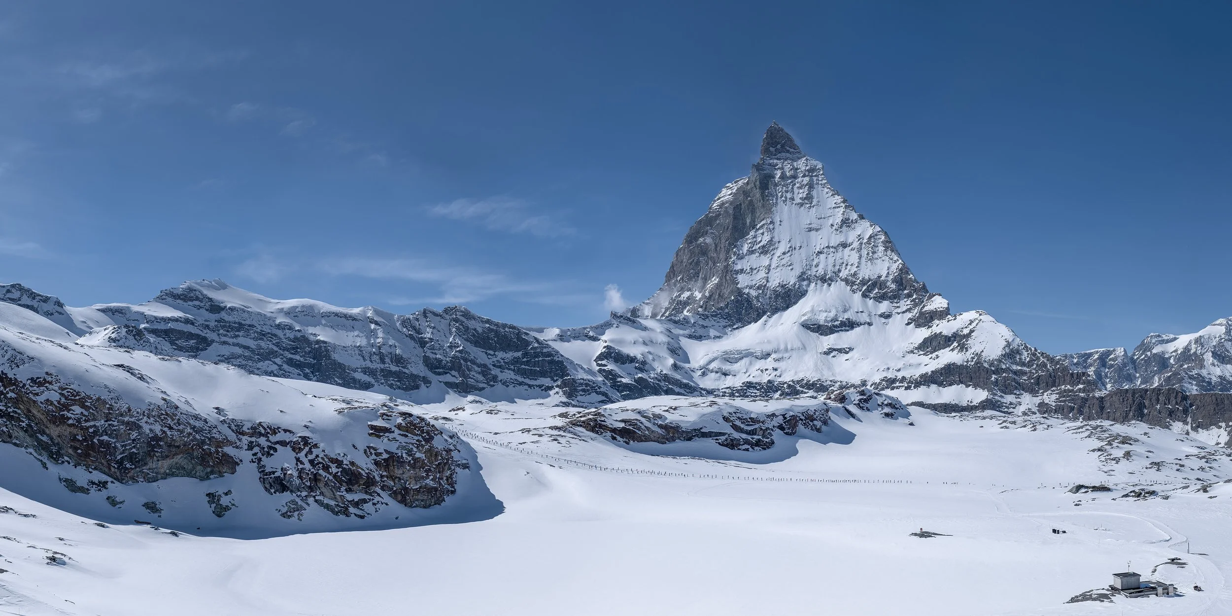 Snow-covered mountains with a prominent pointed peak under a clear blue sky.