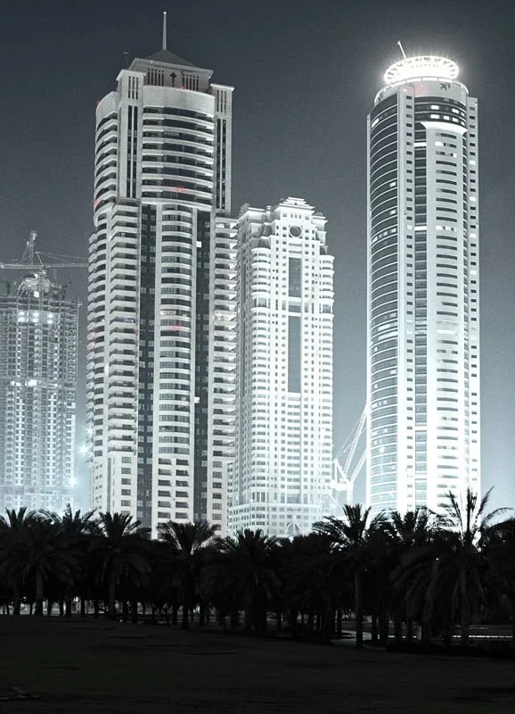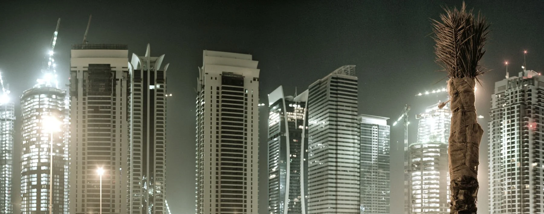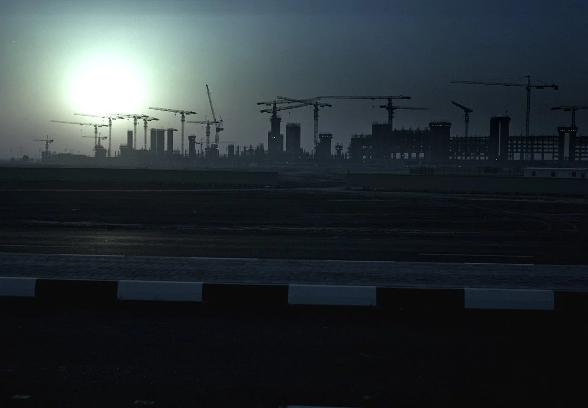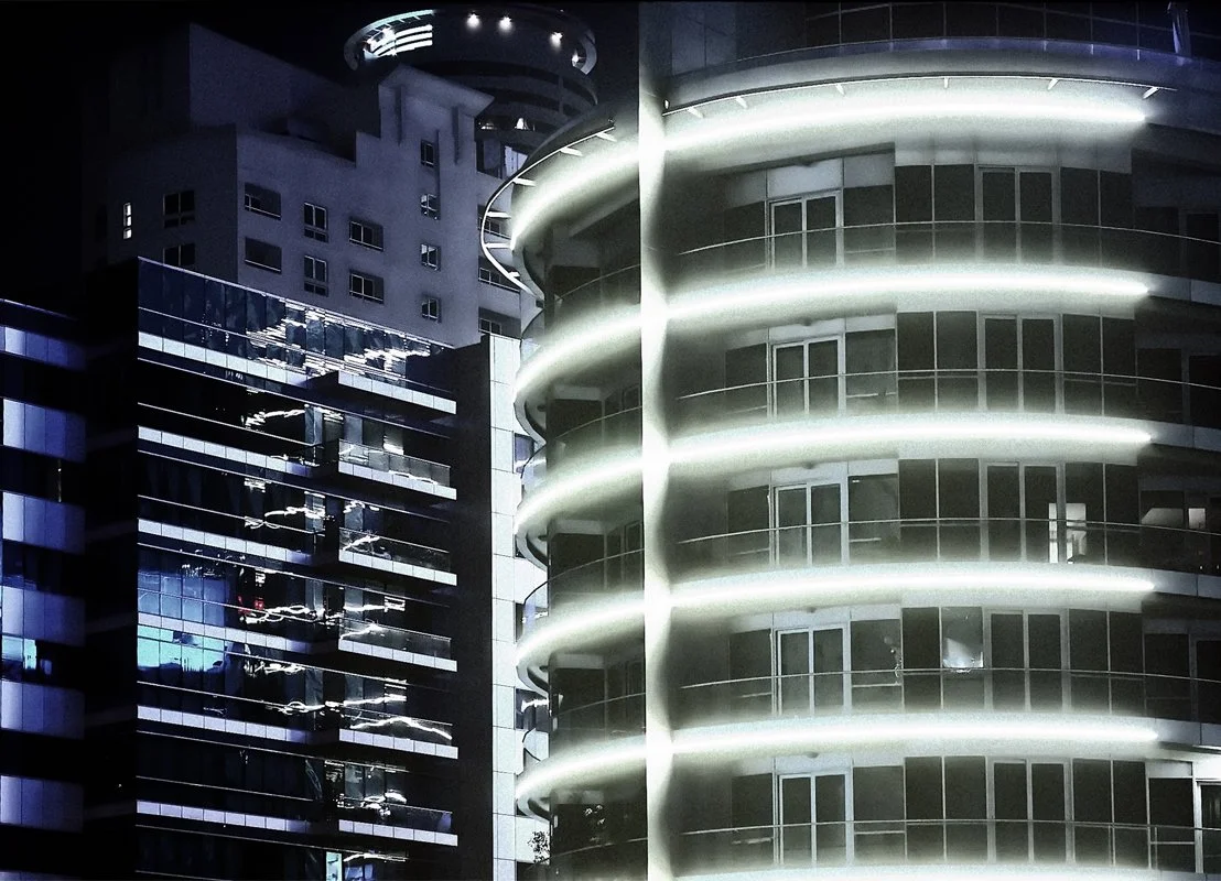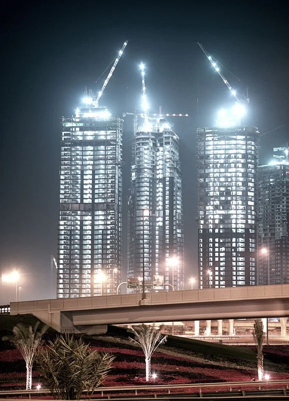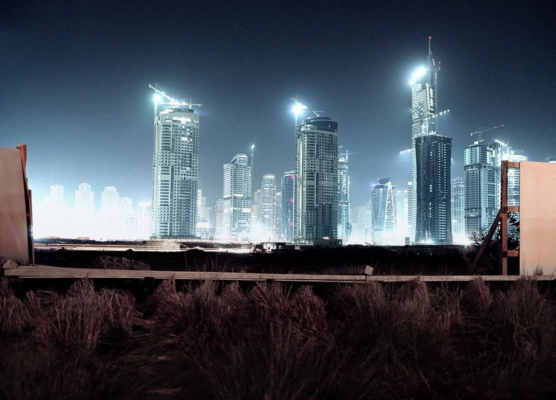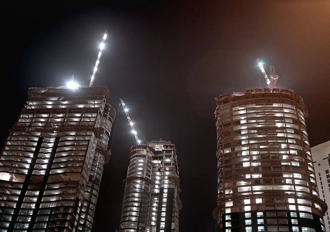 Stadtansicht bei Nacht mit modernen Hochhäusern, Baukränen und reflektierendem Wasser im Vordergrund.