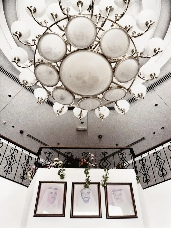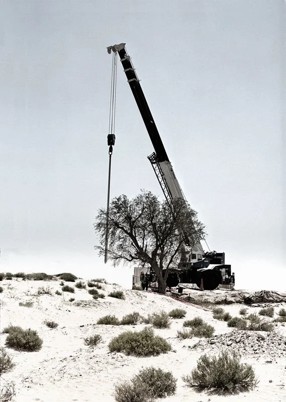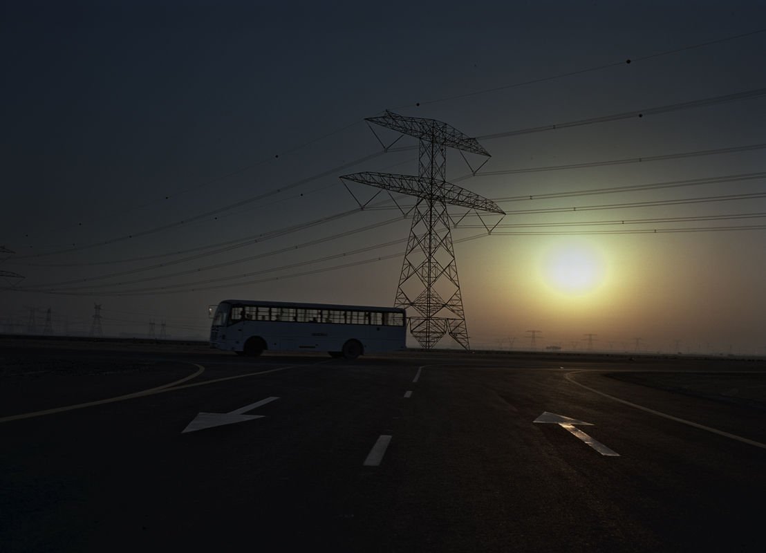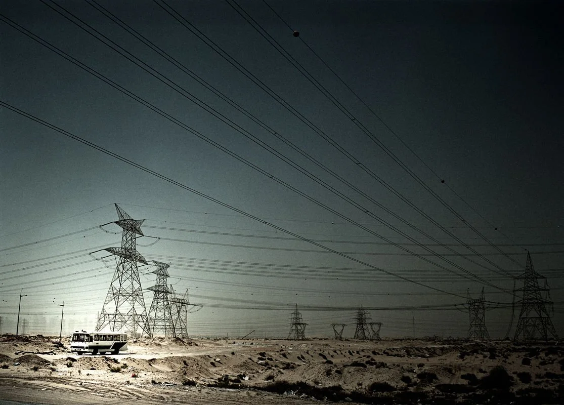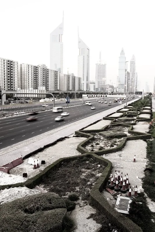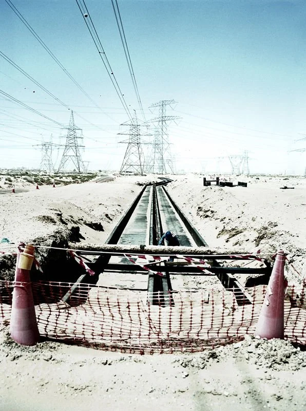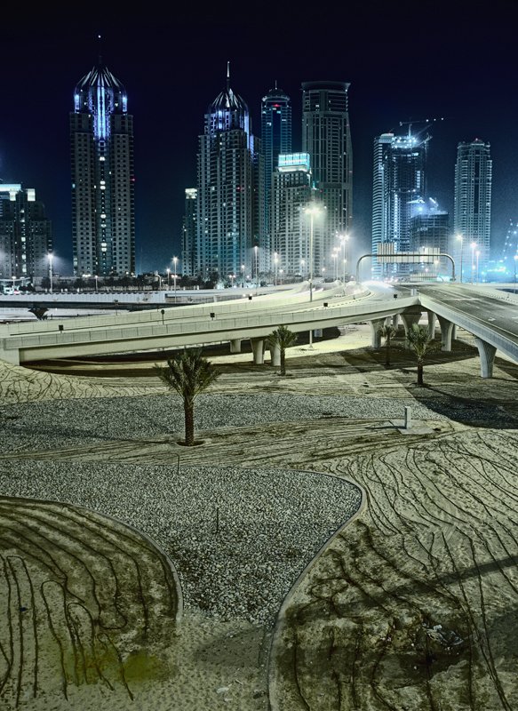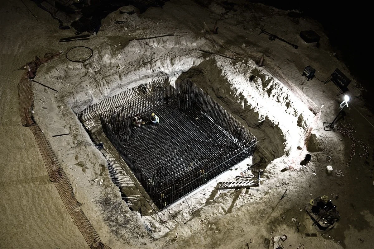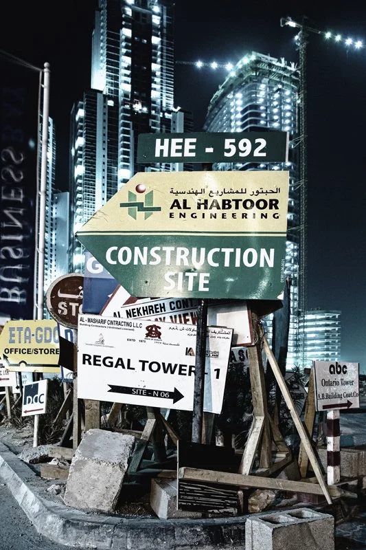 Stadtansicht bei Nacht mit modernen Hochhäusern, Baukränen und reflektierendem Wasser im Vordergrund.